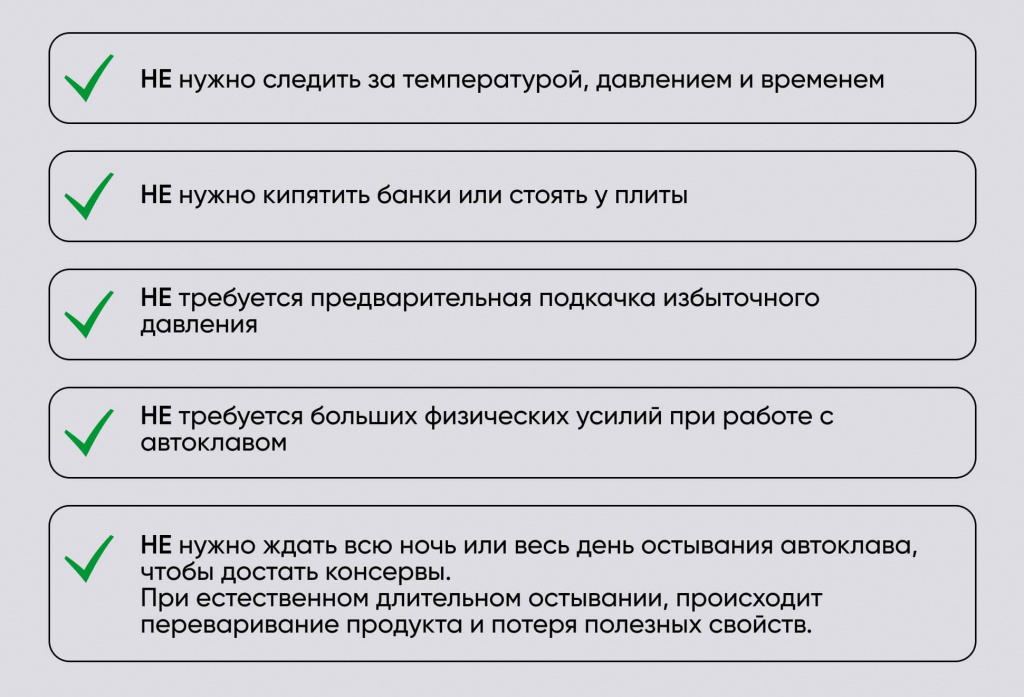 После завершения цикла прибор не требует длительного остывания. Через 30 минут банки можно безопасно извлекать. Такой режим сохраняет витамины и микроэлементы в продуктах, предотвращает переваривание или разрушение текстуры. Это особенно важно для овощей и фруктов, которые в обычной термической обработке теряют часть пользы.