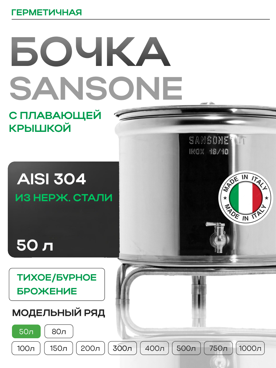 Емкость с пылезащитной и пневматической (плавающей) крышкой из пищевой нержавеющей стали. Подходит для бурного брожения (первичное), для тихого брожения (вторичное) и для длительного хранения (созревания продукта).